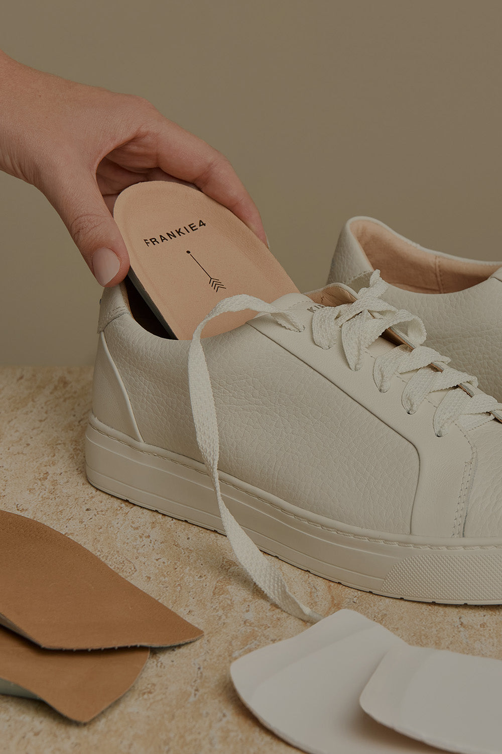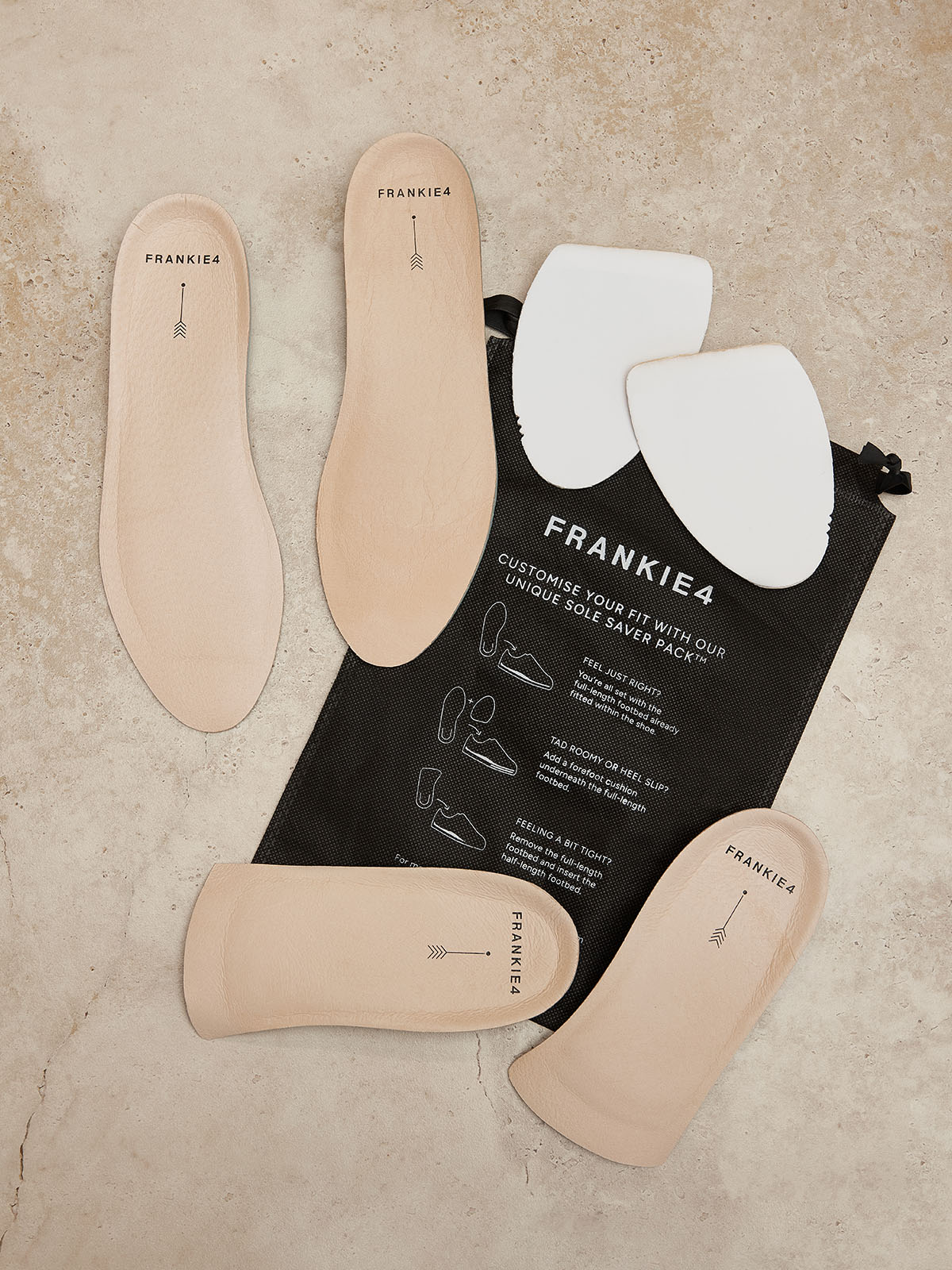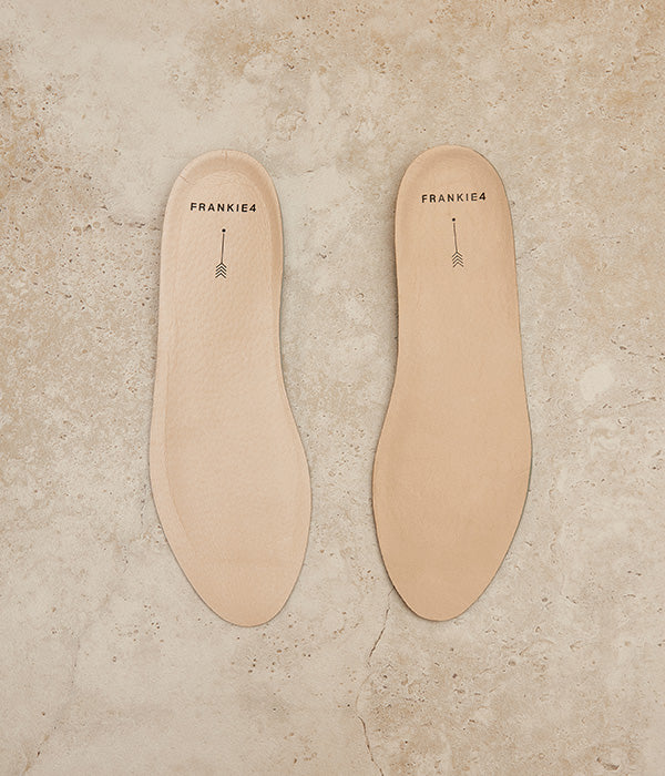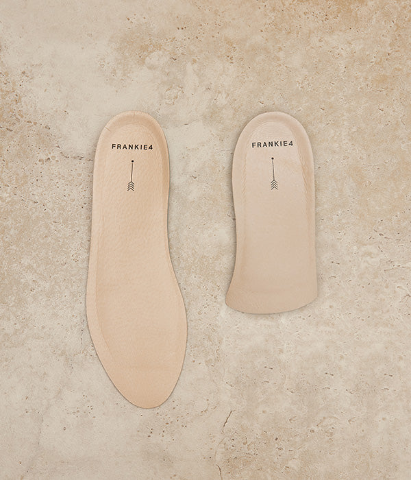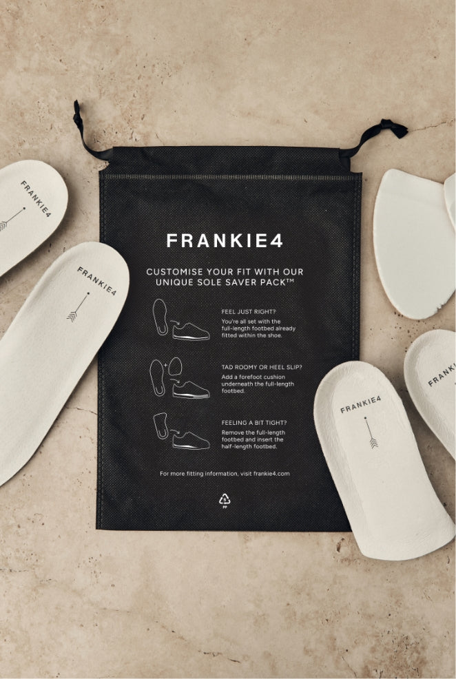 Piece together your perfectly tailored fit with our Sole Saver Pack®. The genius components found in your newly purchased shoes (two full-length footbeds, two half-length footbeds and two forefoot cushions to be exact) and complimentary bag that come in every box of boots, sneakers and most flats for you to mix‑and-match according to your needs. We created this pack because no two feet are the same—narrow, wide, bunioned or not—we want to help FRANKIE4 shoes fit every unique foot like a glove.
