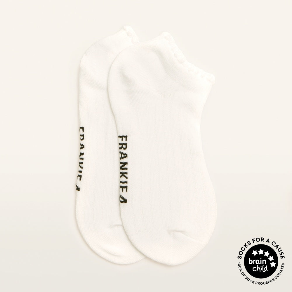 Our essential White Ribbed ankle socks are made from a soft cotton blend and have a subtle picot-edge finish at the ankle. Enjoy the perfect blend of comfort and classic, plus give back. By shopping our socks, you’re supporting families of kids with brain and spinal cord tumours through our partnership with Brainchild Foundation.