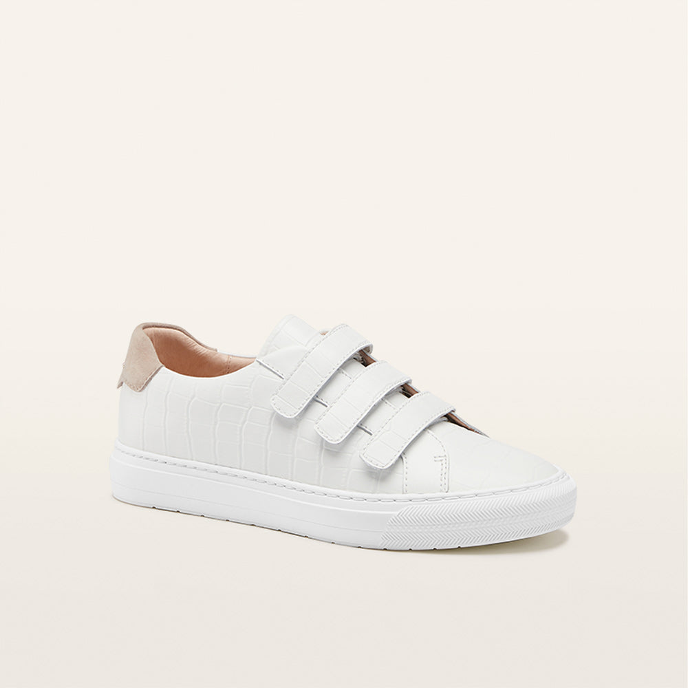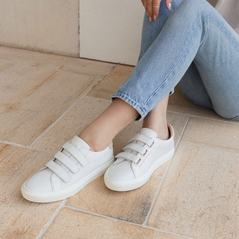 Classic style with amped-up appeal and comfort—Archer in effortlessly chic White Croc Emboss. Archer features a convenient hook and loop system, luxe gold detailing, three layers of intuitive cushioning, and a sleek silhouette designed for superior support. Embossed leather and crisp white soles complete Archer’s tonal story.