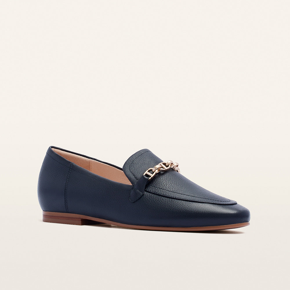 Step into sophistication with Ash in Navy Tumbled—a loafer that transforms everyday style into effortless elegance. An innovative take on the navy leather loafer, Ash is equipped with a hidden heel raise, three layers of support and cushioning, and pressure-relieving foam lining. Proving that luxury is in the details, Ash features customisable fitting options and our renowned footbed technology for optimum comfort. Interlocked gold hardware, a refined almond-shaped toe, and subtly textured leather complete the look.