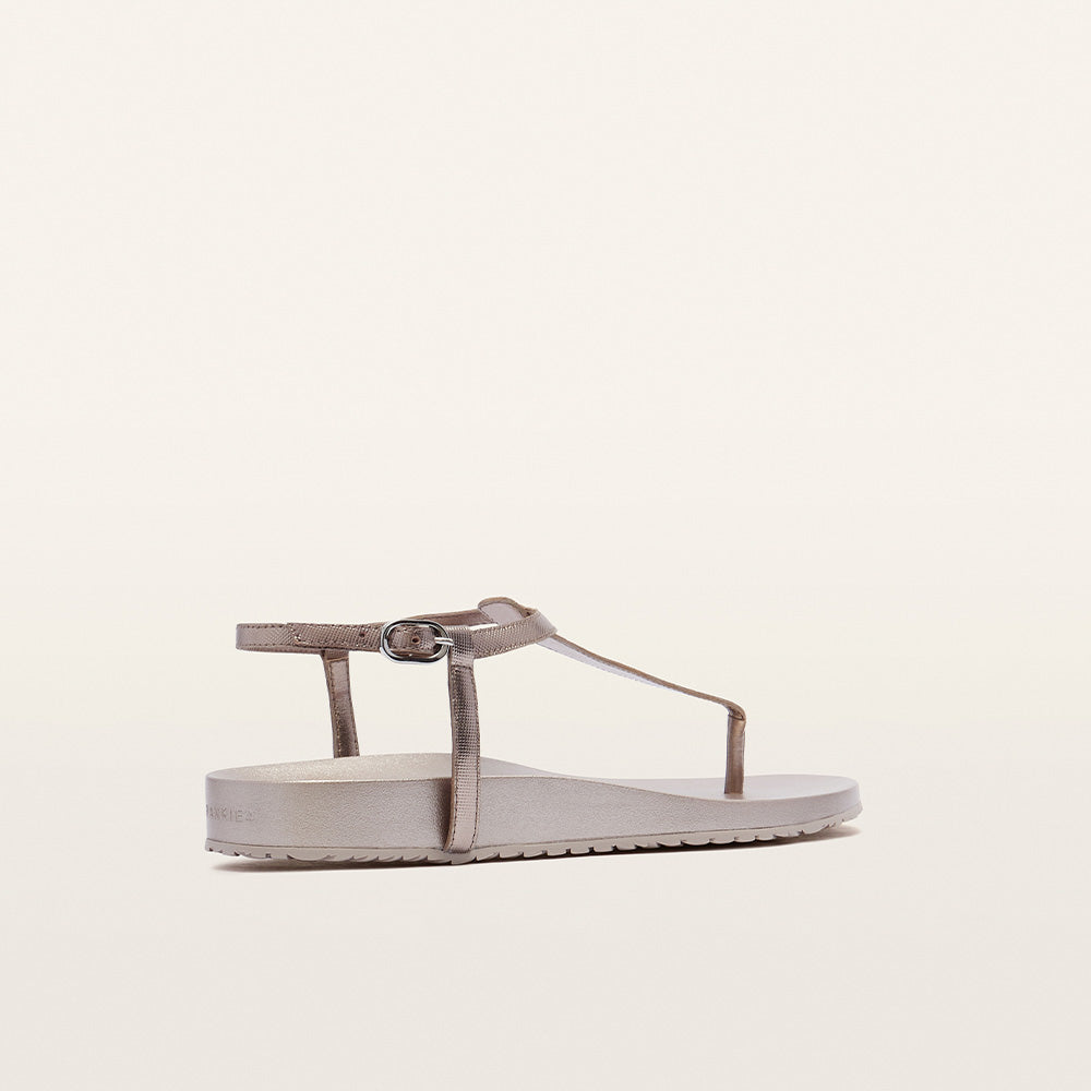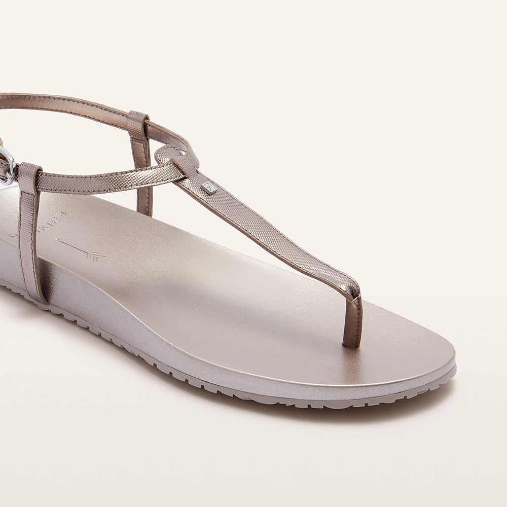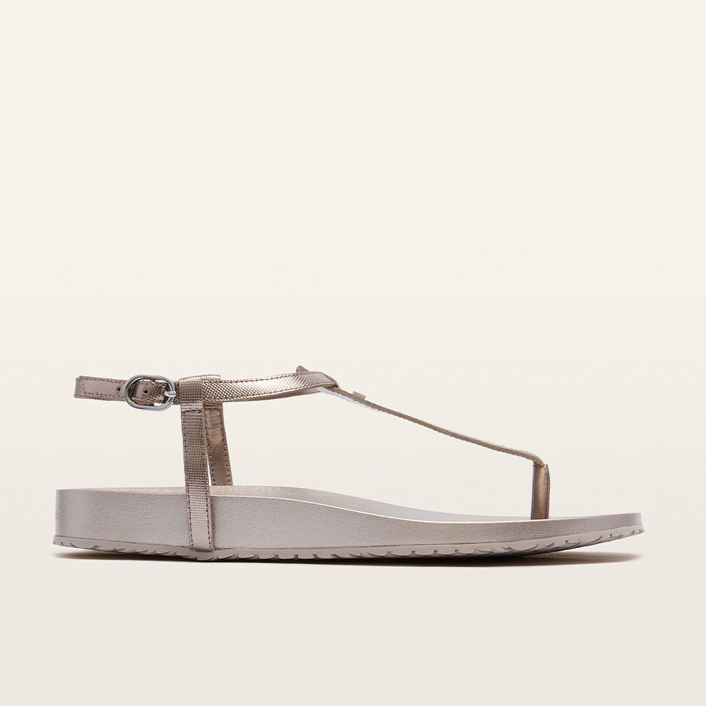 A sleek staple with a touch of shine, Bondi in Platinum is your go-to for sun-drenched days and balmy nights. Crafted from waterproof-treated leather, this beach-friendly toe post sandal features an adjustable ankle strap for a secure, personalised fit and our exclusive monogram stud for a touch of elegance. Underfoot, our podiatrist-designed footbed is cushioned and contoured to support every step—making Bondi as comfortable as it is versatile.