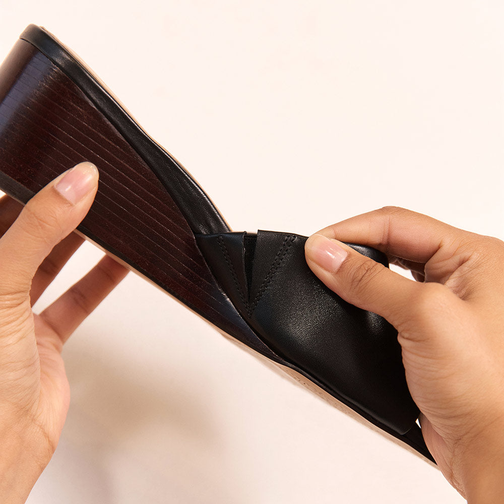 Elegance made to feel effortless, Carmen is the fashion-forward mule that blends timeless style with all-day comfort in classic Black. Set atop a lightweight, mid-height wedge and built with podiatrist-designed technology, our innovative LuxaLite® footbed is contoured and moulded with varying densities, delivering cushioned comfort exactly where you need it most. Finished with a sleek square toe, a hidden elastic gusset for a comfy fit, and a timeless cross-over leather upper, Carmen brings refined sophistication in a design made for everyday ease.