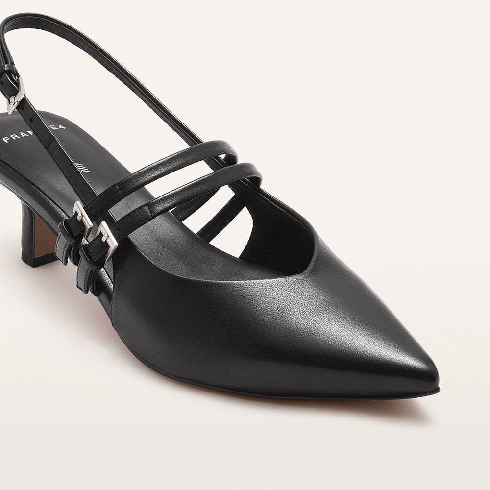 A kitten heel made for movement not just moments: Coco in Black. Crafted in sleek leather, Coco features our LuxaLite® footbed; podiatrist-designed, contoured, and moulded with varying densities for targeted, slimline cushioning. An elegant pointed toe and two adjustable straps with gold hardware complete the look, while complimentary gel cushions enhance comfort and fit. A black heel for work, nights out, and everything in between.