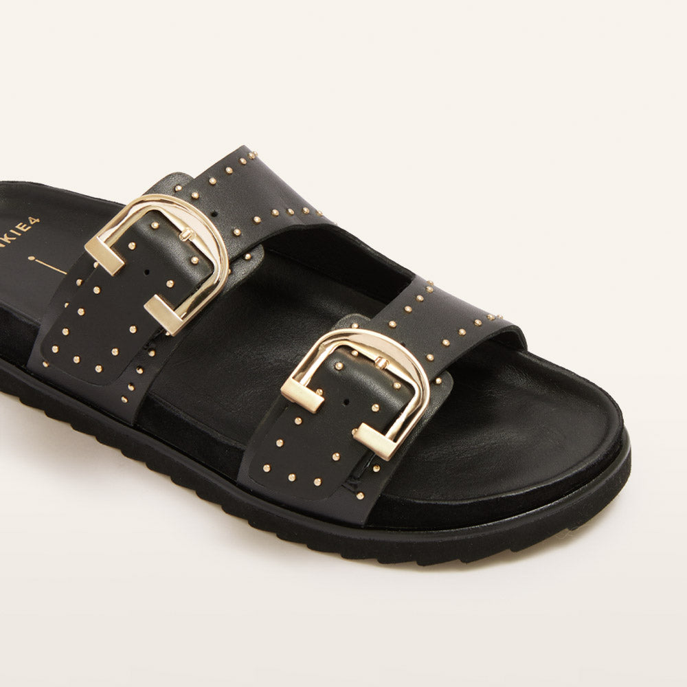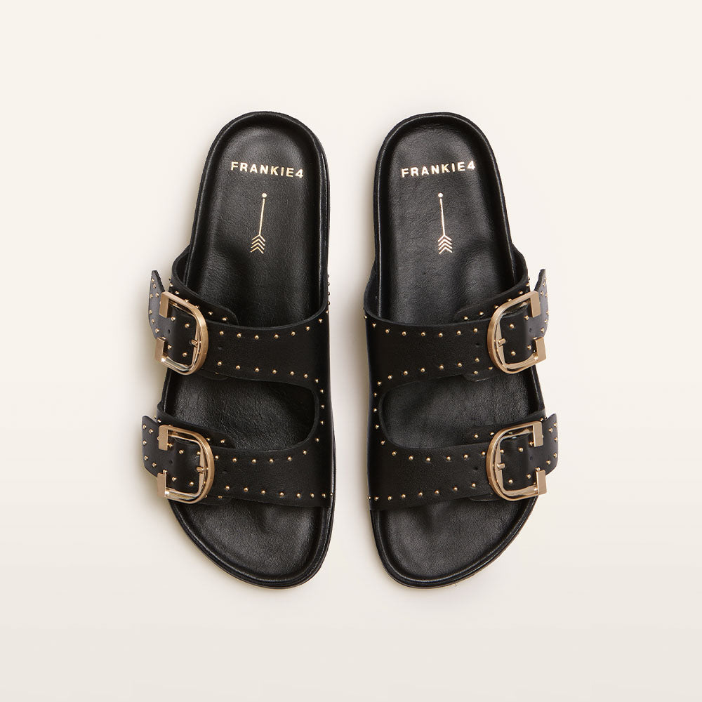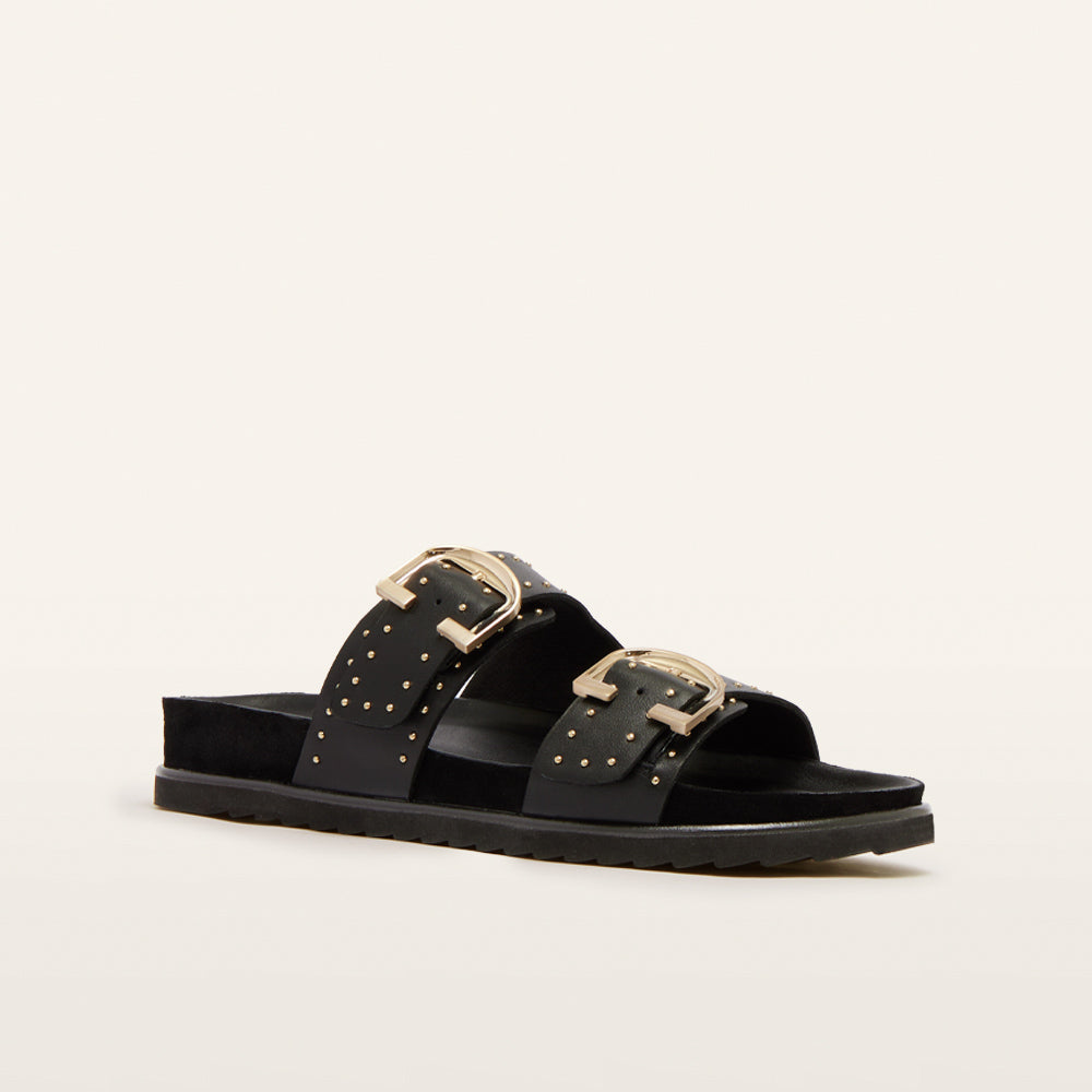 Slide into something comfortable and stylish with Deon—the slides that make a statement in chic Black Stud. With adjustable straps, stud detailing, and our Sole Hero™ Footbed, Deon delivers bold looks and unbeatable comfort. Designed to support your heel, arch, and forefoot, the dual-layer cushion system helps keep foot pain at bay. Crafted with leather and a chunky sawtooth sole, Deon is your go-to for effortless style all day, any day.