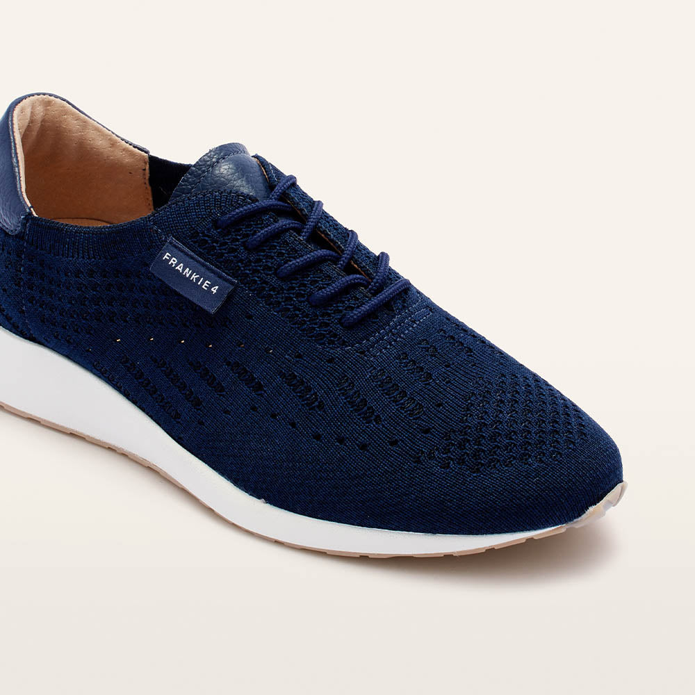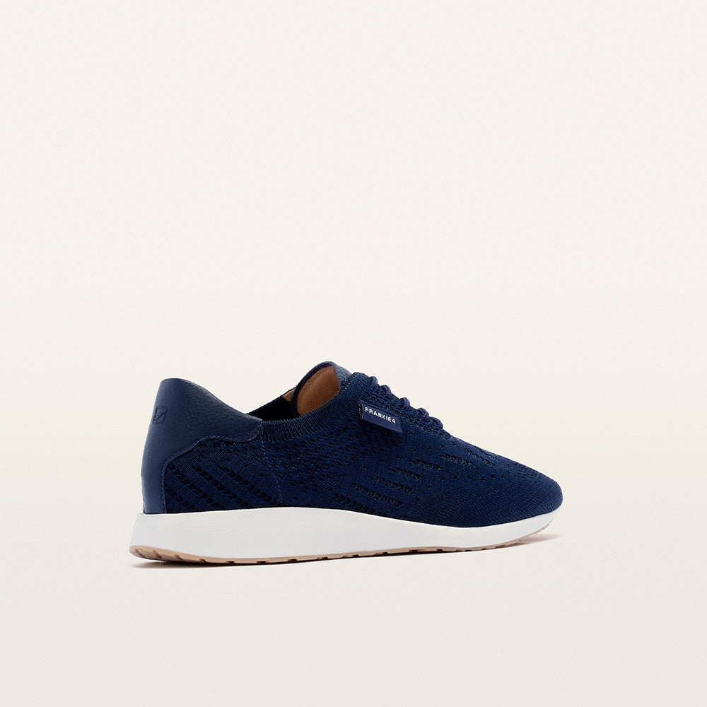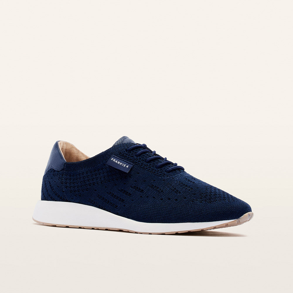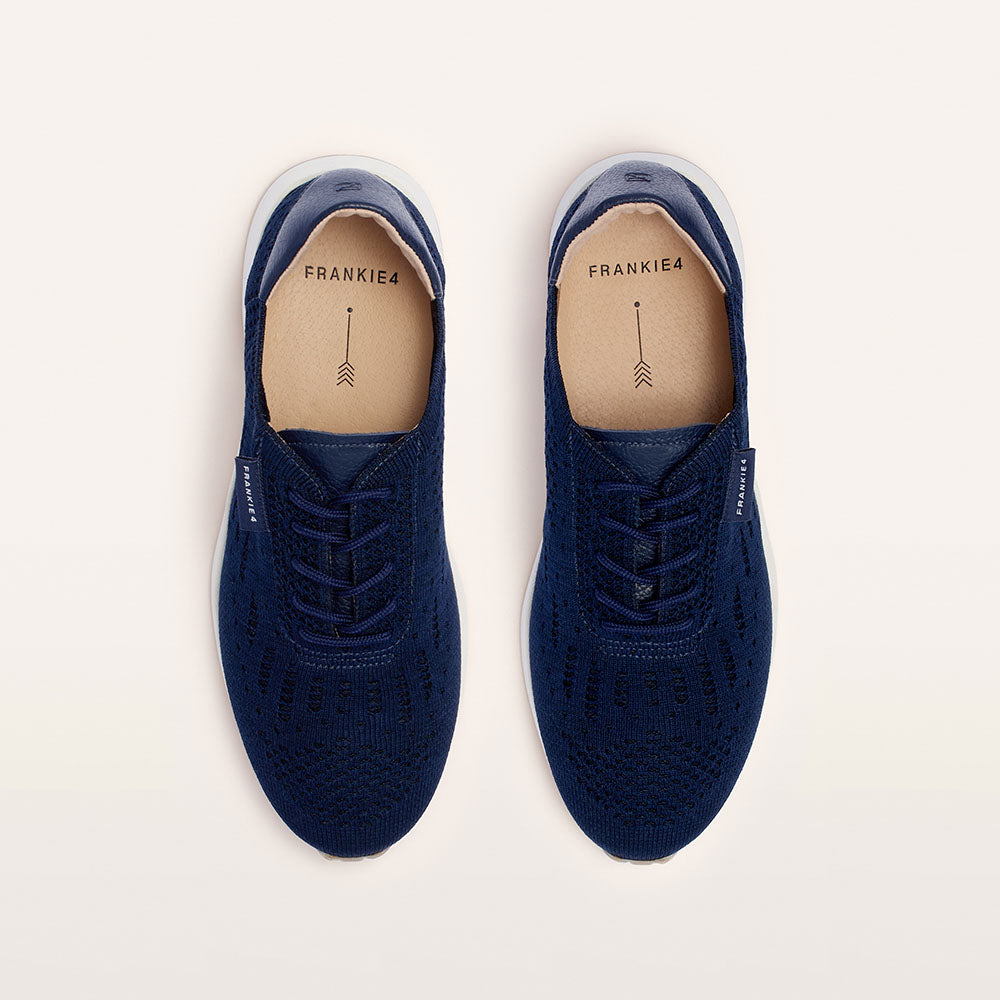 Designed to adapt with science-backed style—Dimity II in Navy Knit. Crafted with a breathable performance knit (made from recycled PET water bottles), these lightweight navy knit sneakers feature a soft, foot-hugging upper, sleek leather accents, and an improved traction sole. Podiatrist-designed support and cushioning making them perfect for travel, walking, and all-day wear.