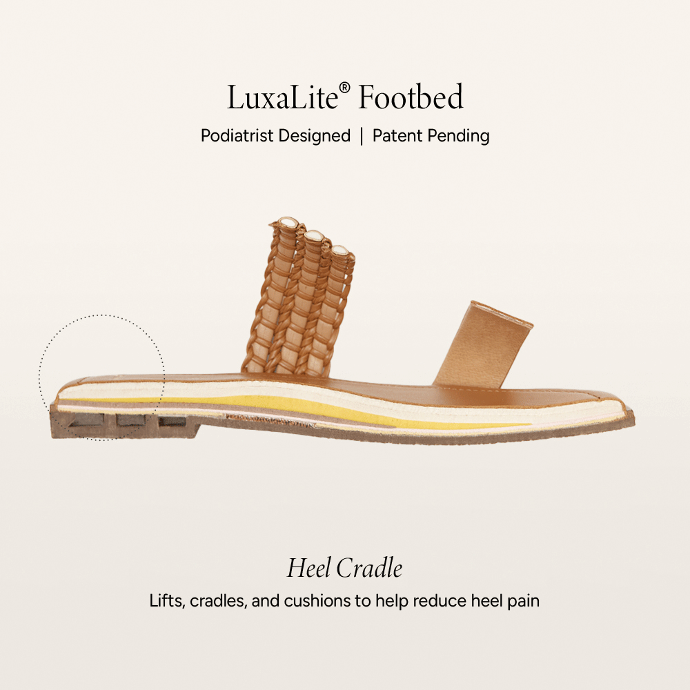 Shine from every angle with Giselle in radiant Gold. This styles features a slimmer fit, consider sizing up for a perfect, comfortable feel. A chic, strappy sandal silhouette that flatters the foot, paired with a luxe leather finish and a sculpted statement heel that turns heads from every angle. Beneath its refined exterior, our innovative LuxaLite® footbed is contoured and moulded with varying densities, delivering cushioned comfort exactly where you need it most. With a layered support and cushioning system and slimline, podiatrist-designed technology, it’s luxury that’s a step ahead.