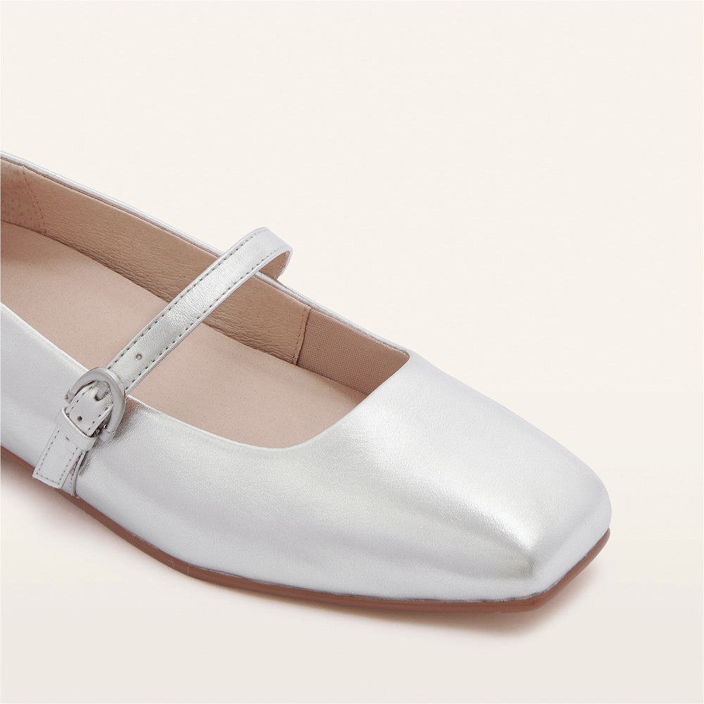A little shimmer, a lot of style—Hepburn in Silver is a Mary Jane with modern star power. Crafted from quality leather with a metallic finish, it features hidden support and a customisable Sole Saver Pack® with adjustable footbeds and forefoot cushions for a tailored fit. Step into silver-screen-worthy sophistication.