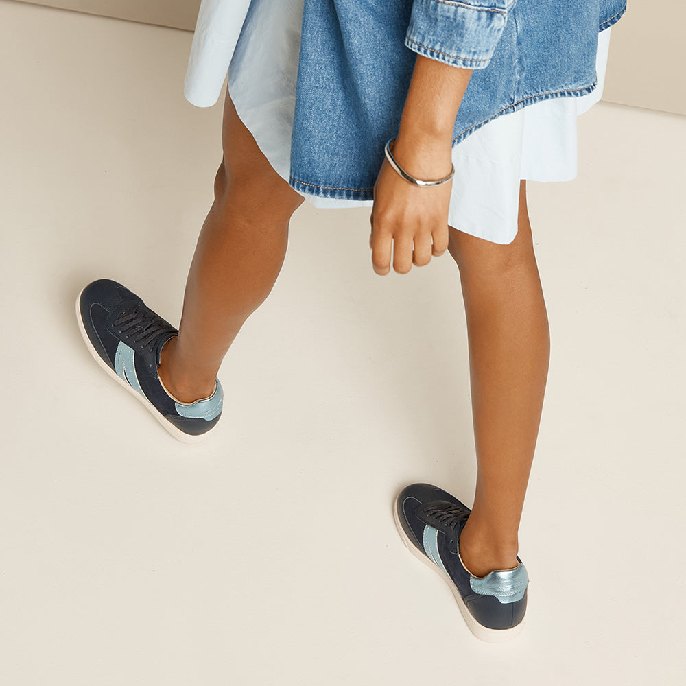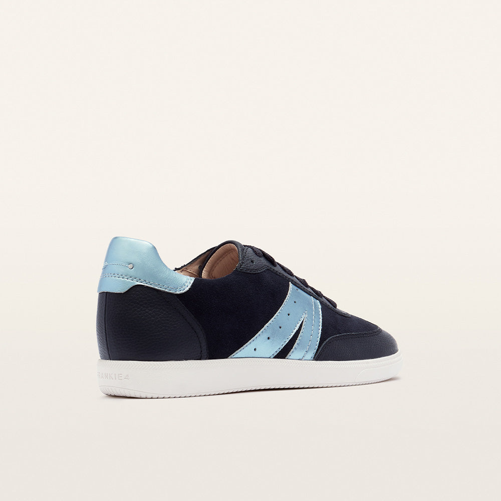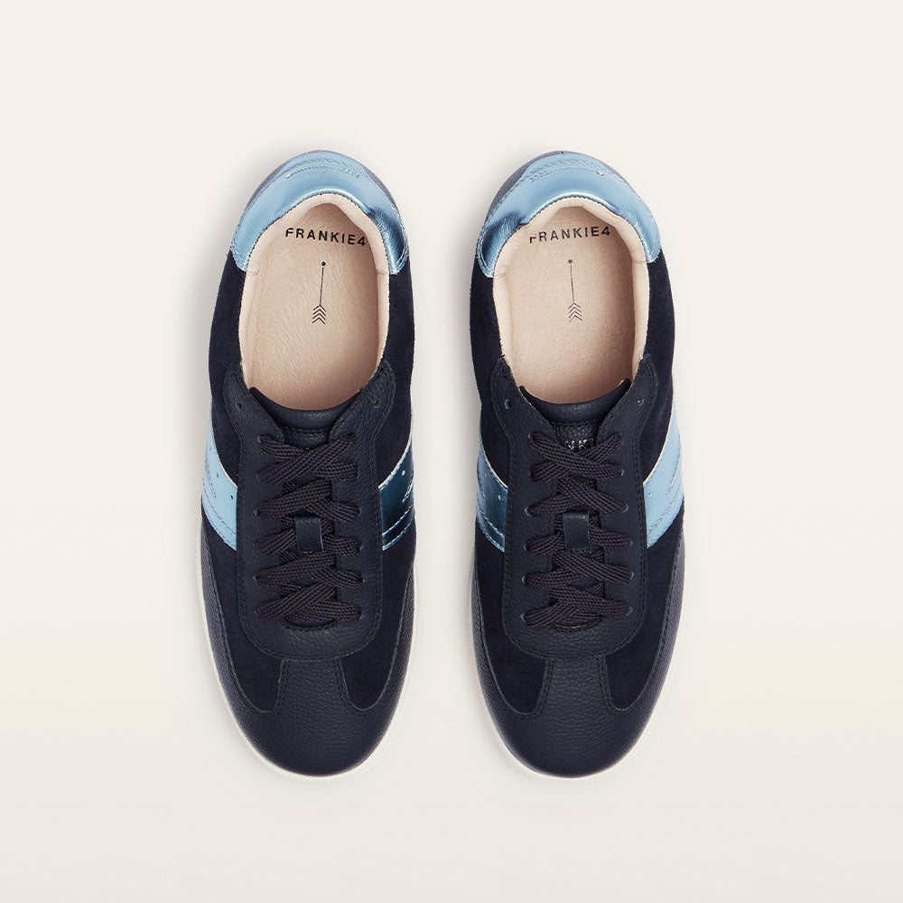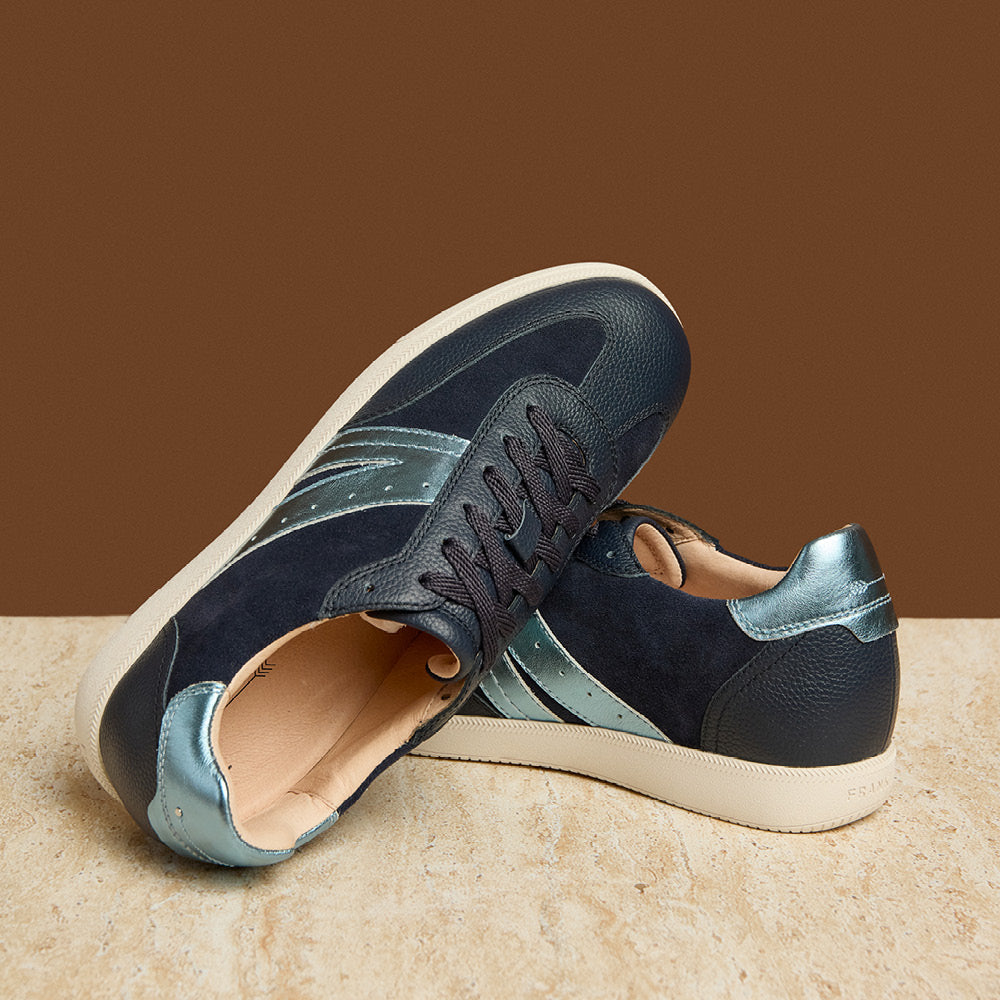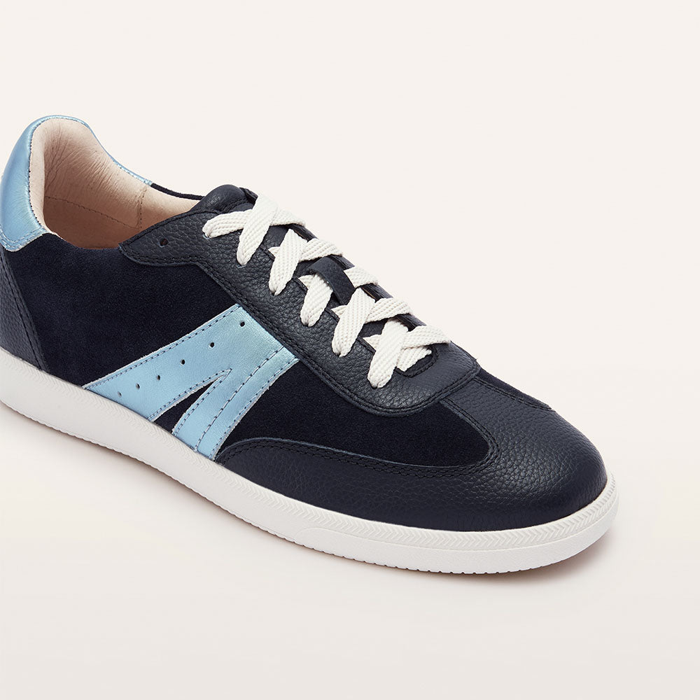 Levi in Blue Night brings deep navy suede and luxe leather together with a subtle metallic accent for a refined yet eye-catching, low-profile sneaker. The vintage-inspired sole enhances the retro aesthetic while providing soft, cushioned support. A perfect blend of sporty and sleek, it’s designed for effortless day-to-night styling.