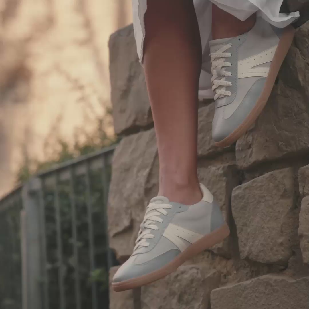 Levi in Bluish pairs soft denim-like tones with crisp white leather accents for a fresh, versatile look. Classic gum soles add a style-coded touch to sole conscious design. Its vintage-inspired, low-profile sneaker silhouette blends sporty charm with casual elegance, making it perfect for both relaxed weekends and polished every-day styling.