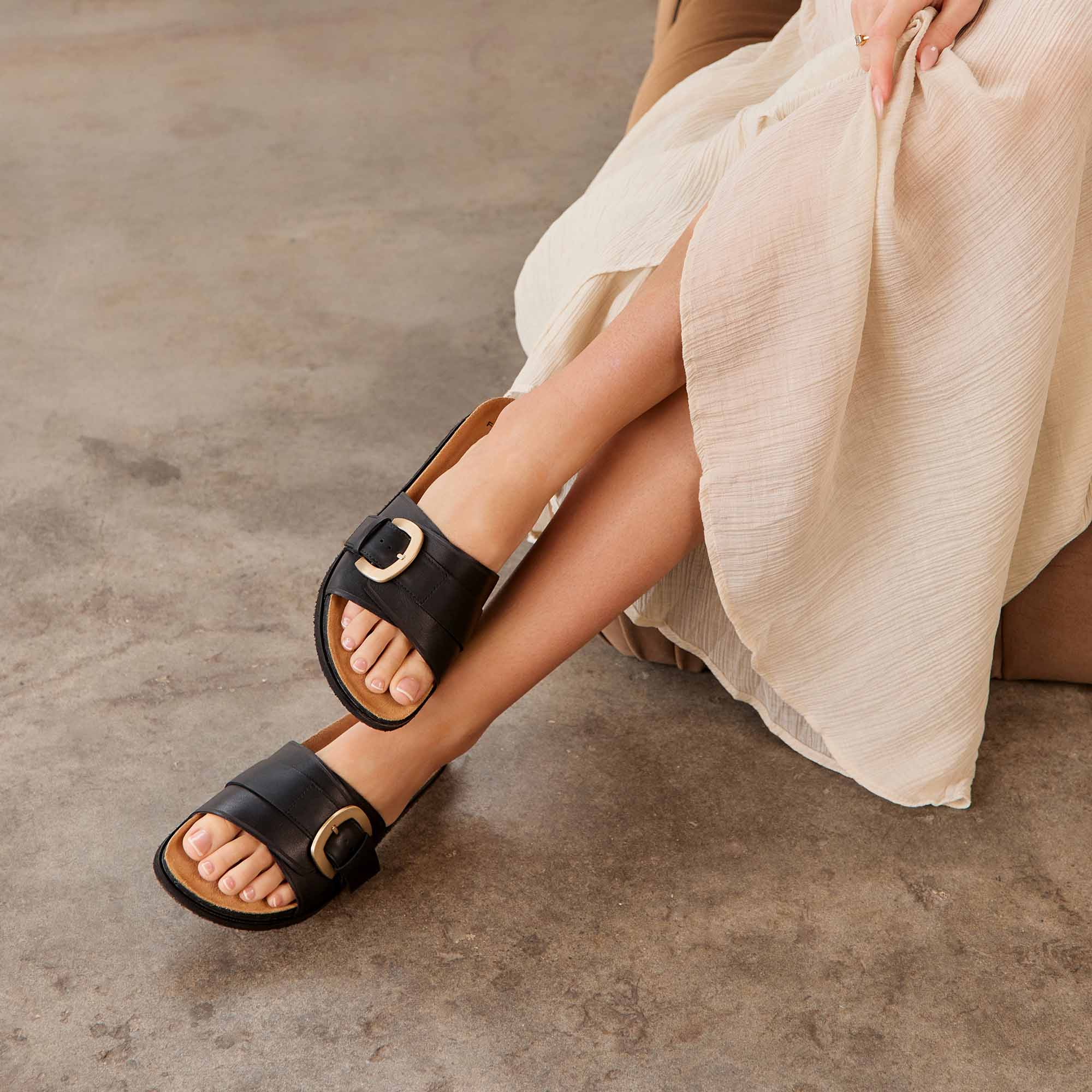 Modern minimalism meets thoughtful support. Monterey in Black is an elevated slide that combines everyday ease with refined details — sleek leather, a statement buckle, and an adjustable upper strap that adapts to wide and narrow soles alike for a perfectly tailored fit. Set on our podiatrist-designed Sole Hero® Footbed, moulded with lightweight, flexible rice husk (an upcycled agricultural byproduct), it offers built-in heel, arch, and forefoot support for all-day comfort. It's luxury you can slide into, every day.