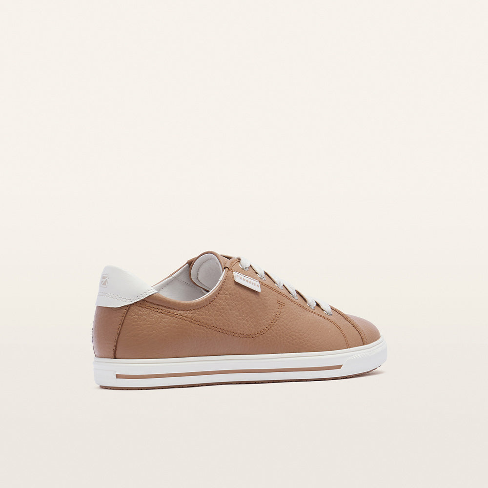The sneaker that moves with you—work, travel, and beyond: Nat in Soft Tan Tumbled. Crafted in soft tumbled leather, this versatile tan sneaker delivers all-day comfort, intentional cushioning, podiatrist-designed footbed technology, and luxe support. An elastic gusset lets you wear it with or without laces, making Nat the effortless choice for style wherever life takes you.