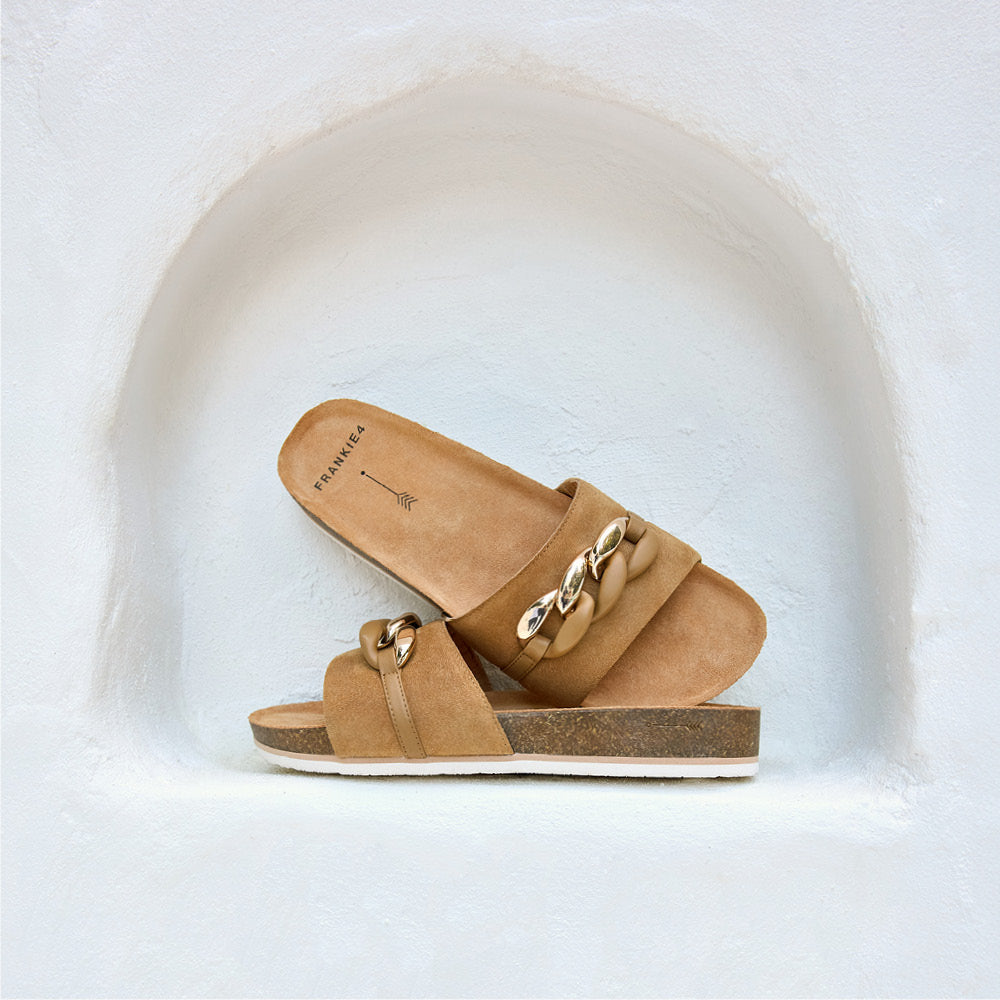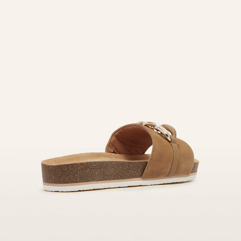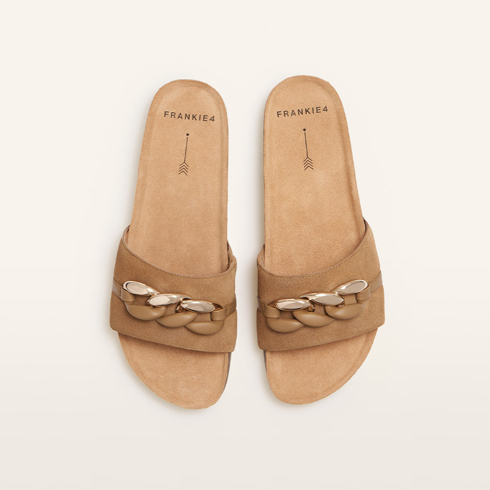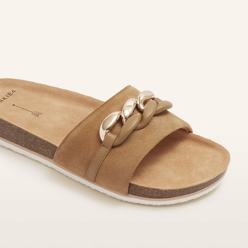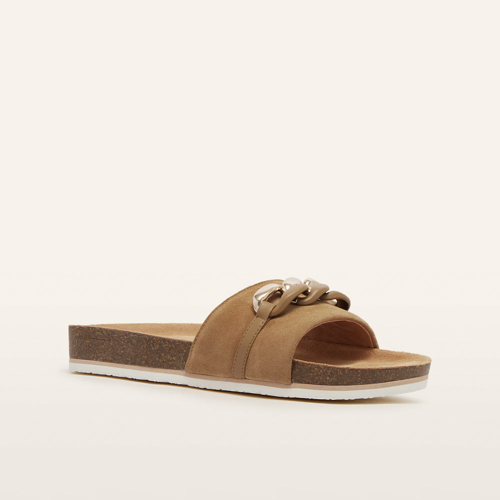 Elevate your wardrobe staples with Quinn in Barley Suede—the perfect every-day hue. Featuring a two-tone metallic chain interlocked with plush leather detailing on the upper and a soft suede finish. Quinn’s expertly layered support ensures all-day comfort while adding understated elegance to both casual and dressy looks. It's quintessential style in a favourite slide silhouette.