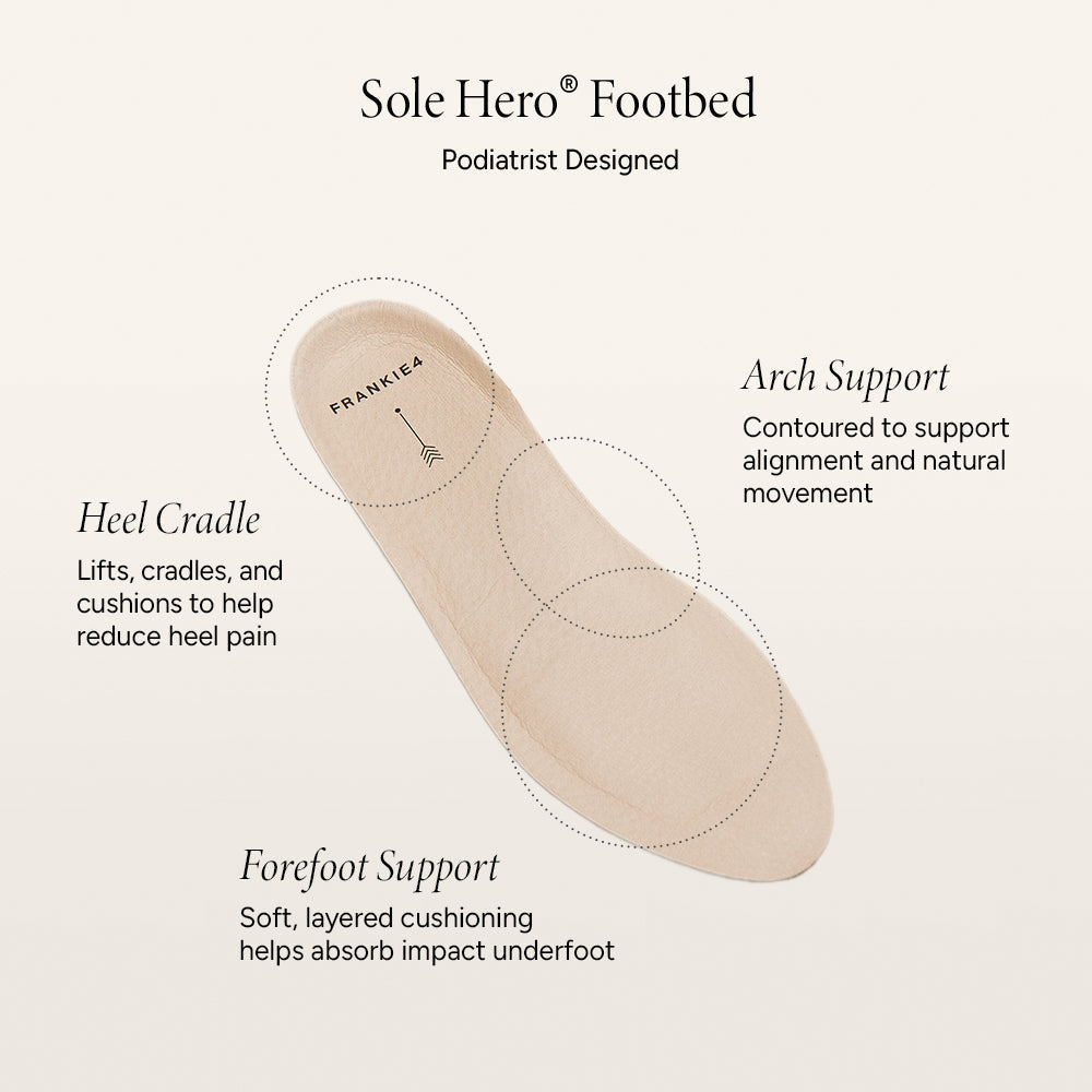 Designed in Australia, every pair of FRANKIE4s features podiatrist-designed support that never compromises on style. Our innovative footbeds are engineered for comfort—whether it’s the Sole Hero® Footbed, which cushions and supports your heel, arch, and forefoot, or the lightweight Luxalite® Footbed, designed to contour to your foot while absorbing shock. Most enclosed styles also include our Sole Saver Pack® to help you customise your fit. Think all-day comfort, made to move with you.