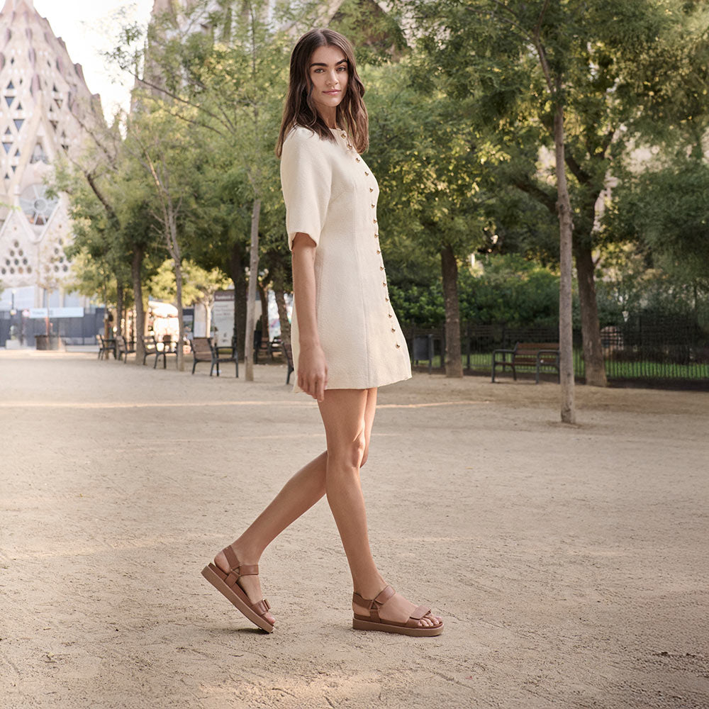 The staple that elevates everyday style, Zane in versatile Tan. Featuring a convenient hook and loop closure, a layered support and cushion system, and a flatform sole with our podiatrist-designed footbed, contoured to support and moulded for comfort. A refined, smooth leather finish with sleek gold hardware gives luxe appeal to an essential sandal with a sporty aesthetic.